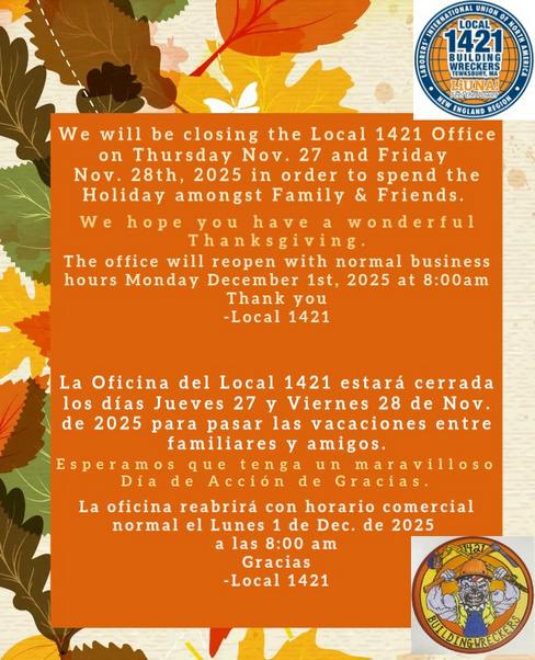 Local 1421 has a state wide agreement and has been working together with all its brother locals across the state to meet the needs of our contractors. Local 1421 is grateful to be a member of the Laborer's International Union of North America. Due to the dedication and foresight of our great leaders at LIUNA, Local 1421 remains committed to clearing the path for progress since 1939.