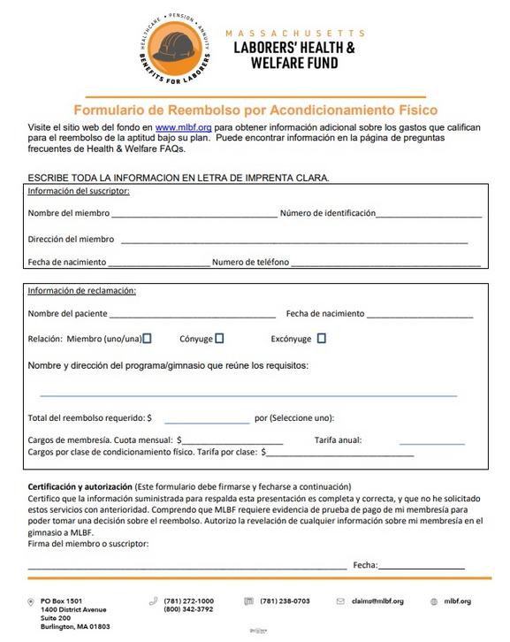 ¿Sabía que nuestros Beneficios para miembros incluyen un reembolso parcial de aptitud física? Llame a su gimnasio y dígales que necesita una copia impresa de su comprobante de membresía para obtener un reembolso de aptitud física en su trabajo. Luego, recoja la copia y envíela junto con este formulario completo.